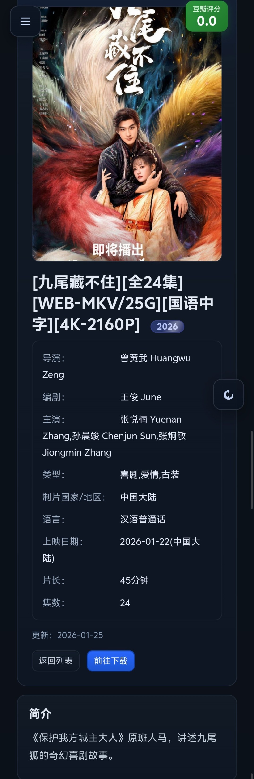 6、[九尾藏不住][全24集][WEB-MKV/25G][国语中字][4K-2160P] 2026 【1.2G/集】免费观看全集高清网盘资源