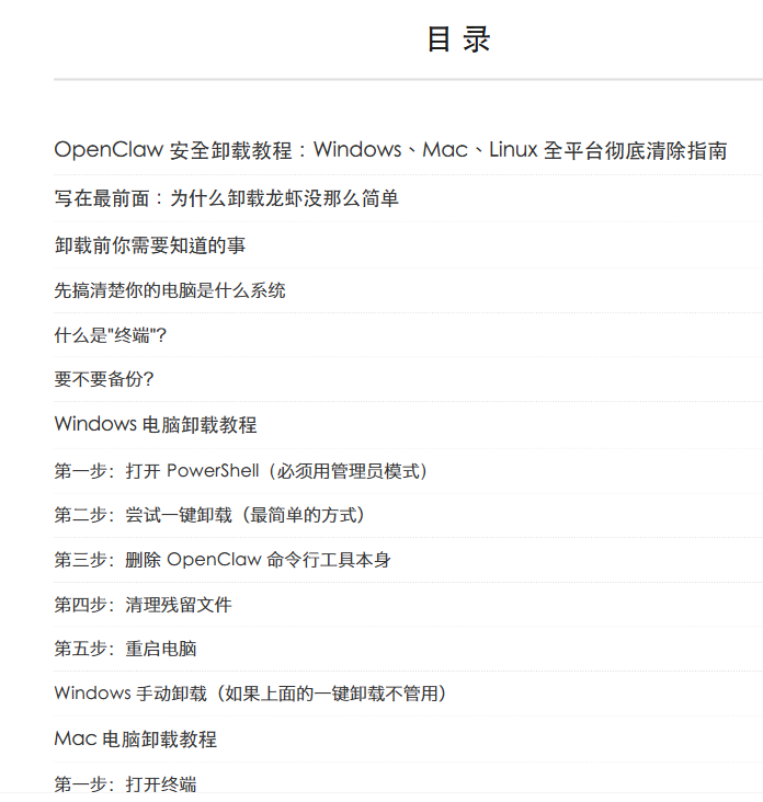 1、本贴标题:OpenClaw 安全卸载教程:Windows、Mac、Linux 全平台彻底清除与避坑指南【1.4MB】